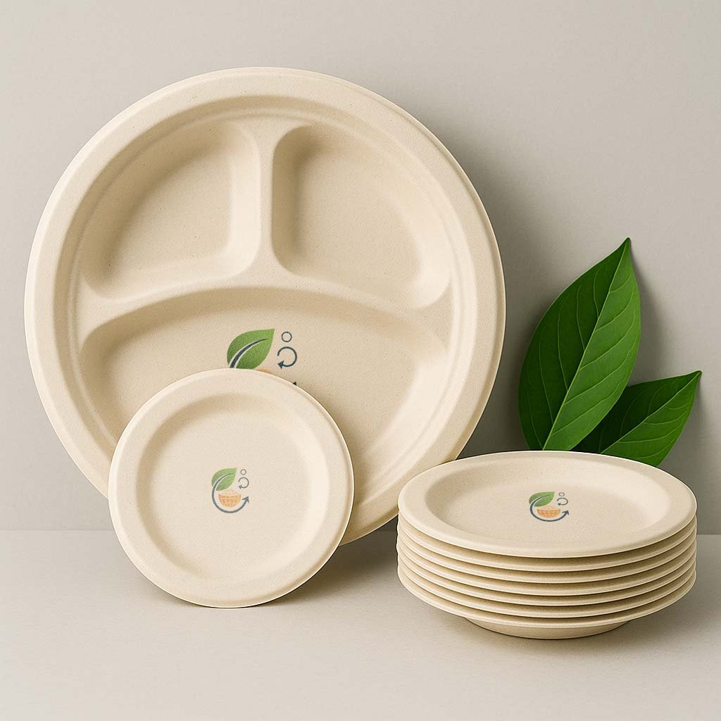 Compostable plates, cups, cutlery & packaging made from bagasse, bamboo, and recycled paper — trusted by cafés, events & global buyers.
